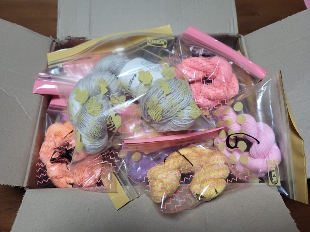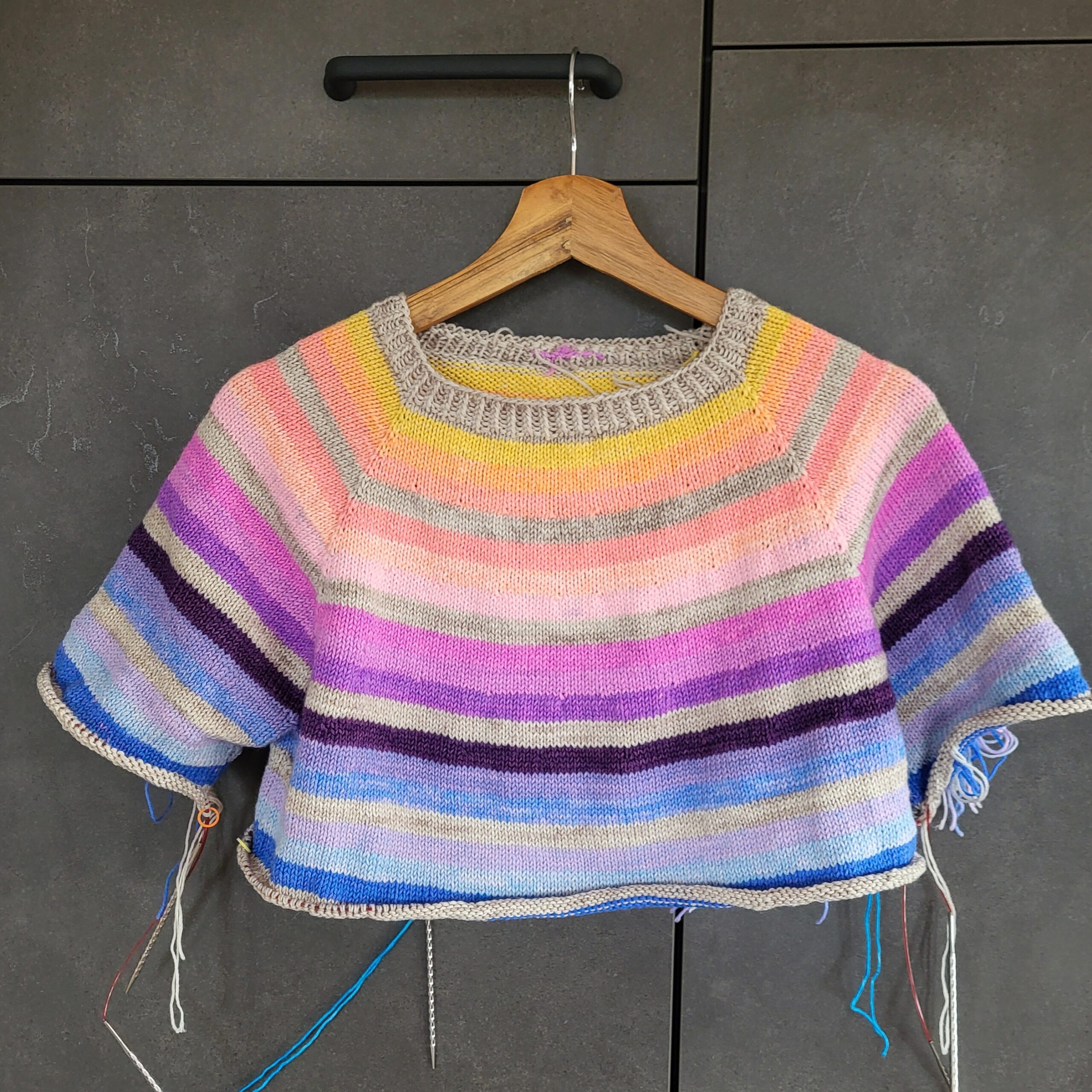 Zunächst habe ich die Farben in die von mir gewünschte Reihenfolge gelegt und sie dann in beschriftete Tütchen gepackt. Das war sehr gut, denn bereits jetzt hatte ich beim Stricken manchmal den Eindruck, dass ich es vielleicht anders sortieren würde, aber insgesamt bin ich sehr zufrieden mit meinem ursprünglichen Plan. Da mir vermutlich 24 Streifen à fünf Reihen plus alle drei Farbstreifenfolgen einen Streifen im Kontrastgarn auch à fünf Reihen von der Länge her nicht reichen werden, habe ich noch drei Farben aus einem Moonwalkerüberraschungspaket mit fünf kleinen Strängen hinzugenommen. Ach ja, bevor ich es vergesse: ich stricke den Valentine Candy von Anke Telschow. Das ist eine kostenlose Anleitung für einen wunderbaren RVO (Raglan von oben)-Pullover gestrickt aus Wolle in der Stärke DK. Darum verstricke ich die Moonwalker doppelfädig, was die wunderbaren Schattierungen der Handfärbung m.E. noch besser hervorbringt.