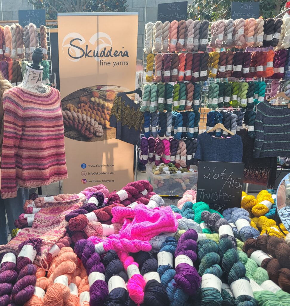 Nicht nur, dass ich beim #FJKA2026 mitmache, ich bin auch beim #aprilvent von den #strickelfen dabei. Und das hat auch mit dem Wollefest Leipzig zu tun, denn dort habe ich die Färberin meines Adventskalenders von 2025 getroffen und sie hat an ihrem Stand auch das Modell ausgestellt, das ich aus der Adventskalenderwolle herstellen werde. Es handelt sich um Skudderia. Für meinen Adventskalender habe ich mir für die Qualität Moonwalker entschieden und 24 kleine Stränge und einen farblich dazu passenden 100-Gramm-Strang gekauft. Mit dazu gab es viele schöne Kleinigkeiten, davon habe ich aber leider kein Foto gemacht.