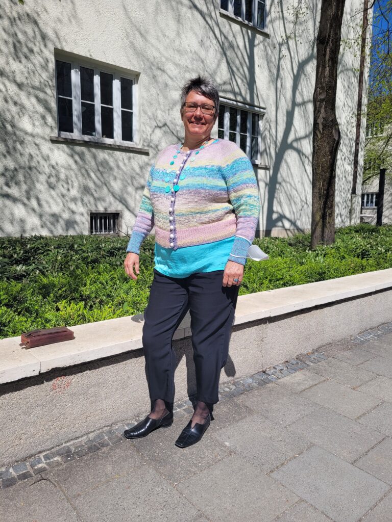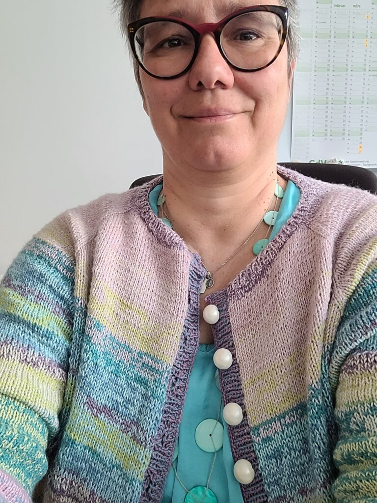 Ich bin nicht zum ersten Mal dabei, bereits 2022 war ich vertreten, allerdings findet man meine alten Blogbeiträge nicht mehr, weil ich den Blog zwischendrin aufgegeben habe. Aber das Projekt ist noch in Ravelry vorhanden, ich habe nach der Anleitung Twinkle-Twinkle Feinmotorik gestrickt. Auch ein Tragefoto kann ich vorweisen: